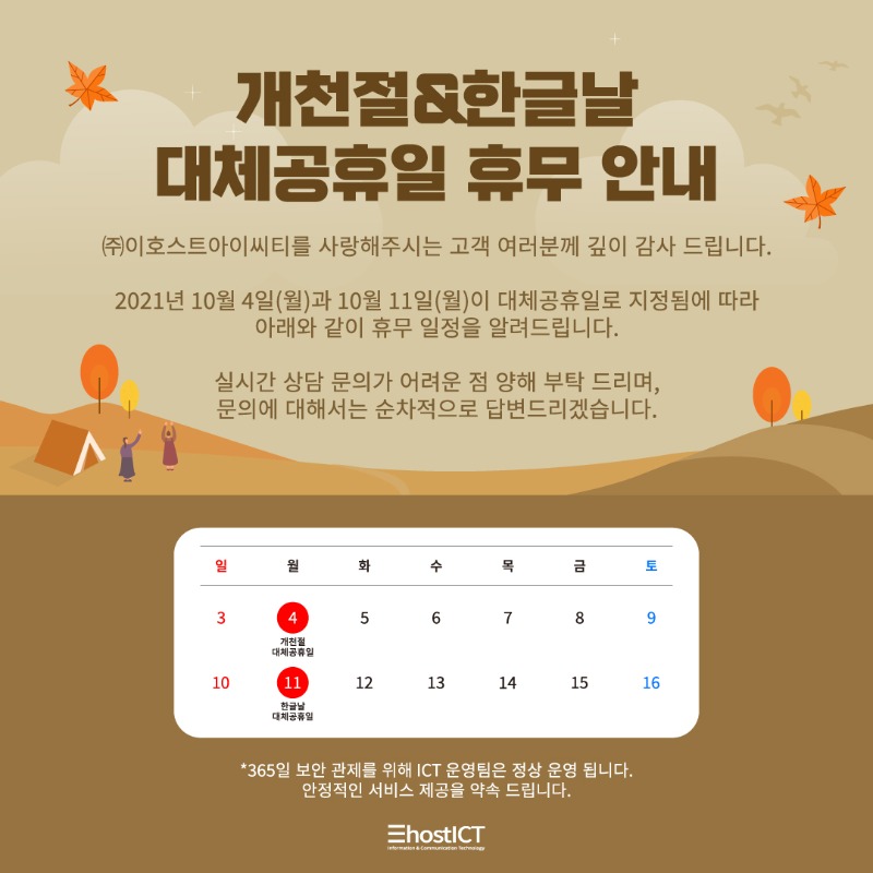 ㈜이호스트아이씨티를 사랑해주시는 고객 여러분께 깊이 감사 드립니다. 2021년 10월 4일(월)과 10월 11일(월)이 대체공휴일로 지정됨에 따라 아래와 같이 휴무 일정을 알려드립니다. ■휴무 일정 -2021.10.04(월) : 개천절 대체공휴일 -2021.10.11(월) : 한글날 대체공휴일 해당 기간 실시간 상담 문의가 어려운 점 양해 부탁 드리며, 문의에 대해서는 순차적으로 답변드리겠습니다. *365일 보안 관제를 위해 ICT 운영팀은 정상 운영 됩니다. 안정적인 서비스 제공을 약속 드립니다. |