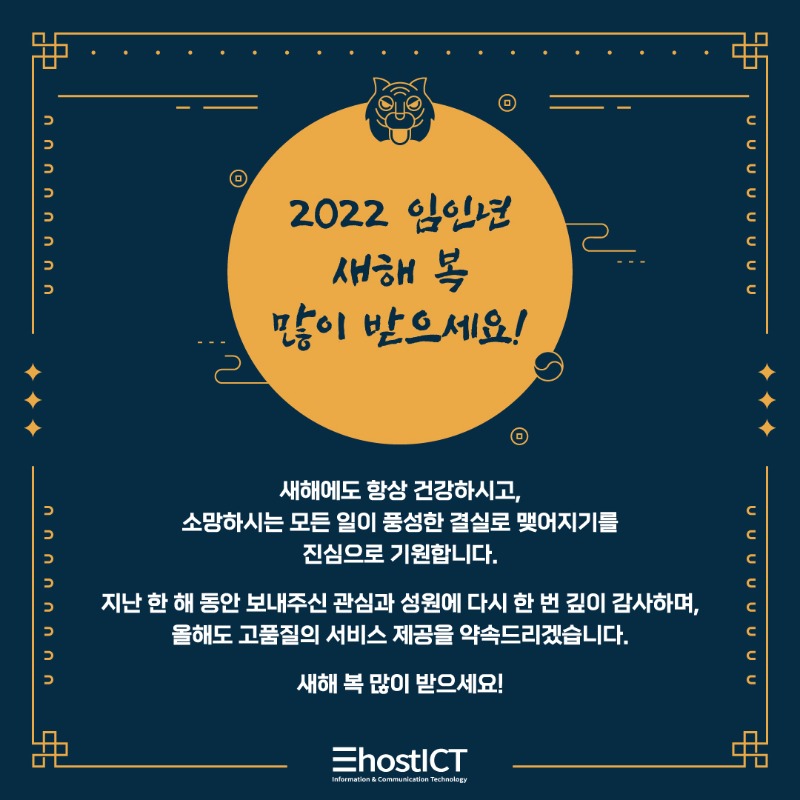 2022 임인년 새해 복 많이 받으세요! 새해에도 항상 건강하시고, 소망하시는 모든 일이 풍성한 결실로 맺어지기를 진심으로 기원합니다. 지난 한 해 동안 보내주신 관심과 성원에 다시 한 번 깊이 감사하며, 올해도 고품질의 서비스 제공을 약속드리겠습니다. 새해 복 많이 받으세요! -이호스트 ICT 올림- |