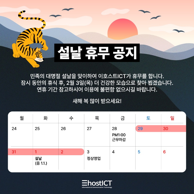 잠시 동안의 휴식 후, 2월 3일(목) 더 건강한 모습으로 찾아 뵙겠습니다. 연휴 기간 참고하시어 이용에 불편함 없으시길 바랍니다. 새해 복 많이 받으세요!