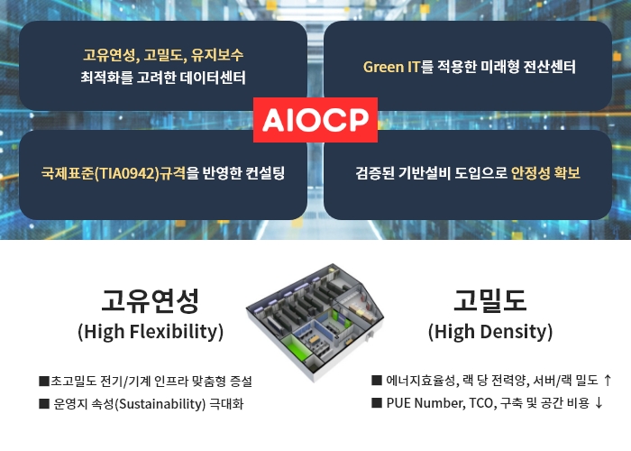 고유연성과 고밀도 갖춘 AI 전용 단독 전산실(POD)&IDC 구축 컨설팅 친환경성을 수용하는 Green IT 적용 미래형 전산센터 구축을 돕는 컨설팅 서비스는 고유연성(High Flexibility)과 고밀도(High Density)를 특징으로 한다. 초고밀도의 전기/기계 인프라 맞춤형 증설을 통해 운영지 속성을 극대화하며, 랙 당 전력량, 서버/랙 밀도를 높여 에너지 효율성을 극대화한다는 것이다. 국제표준(TIA0942)규격을 반영하고 검증된 기반설비 도입으로 안정성을 확보할 뿐 아니라 PUE Number, TCO, 구축 및 공간 비용은 상대적으로 적게 소요될 수 있다.